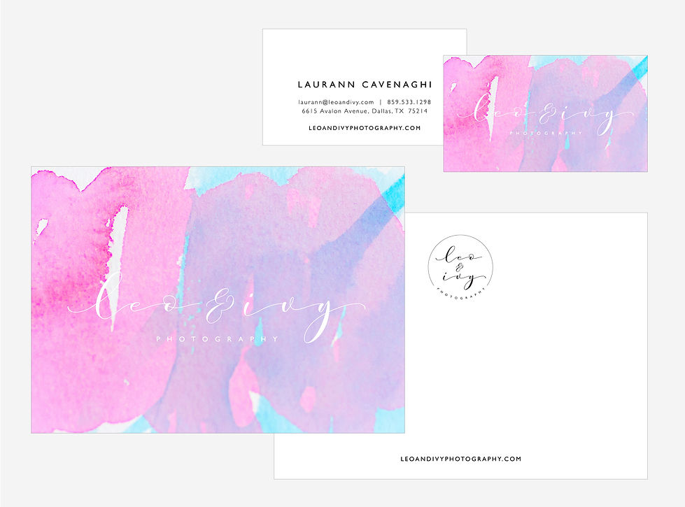 Leo & Ivy Photography, named after the photographer's children, is a family lifestyle photographer who's goal is to capture the magic of everyday childhood. We created a playfully elegant handwritten logo featuring a bright watercolor (created by her son Leo) and color palette to convey this theme throughout her brand materials.